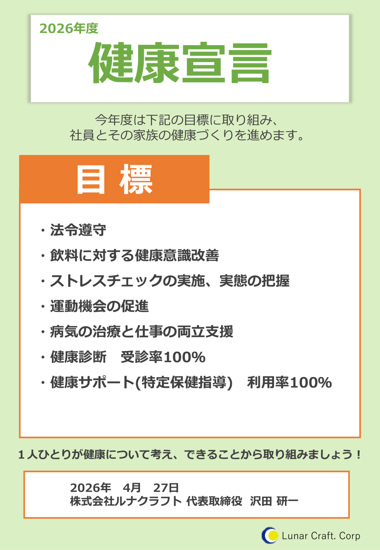 株式会社ルナクラフトは、今年度も健康宣言を表明いたしました。